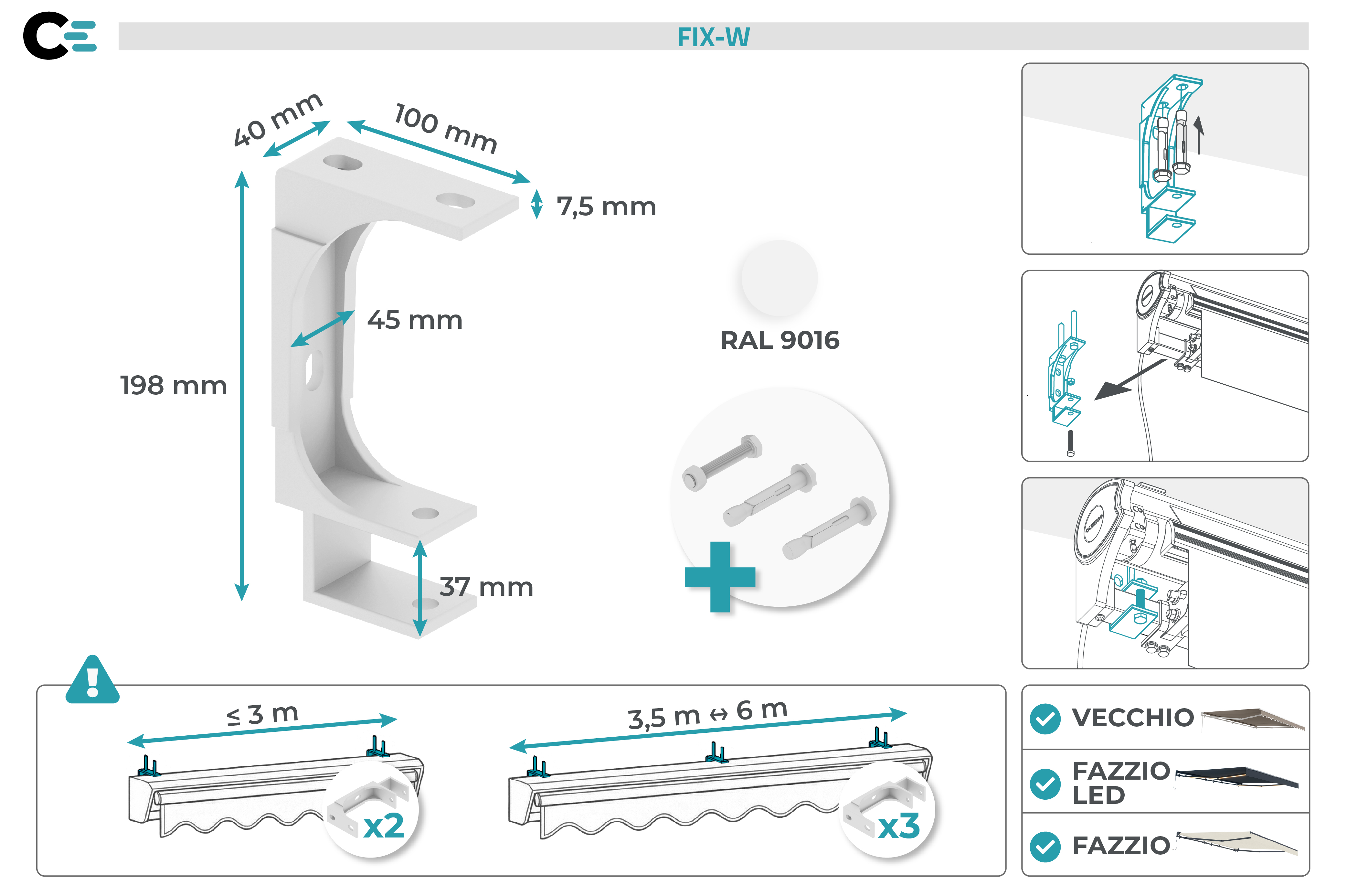 Ten uchwyt jest kompatybilny z modelami markiz VECCHIO, FAZZIO i FAZZIO LED. Kompaktowy (198 x 100 x 45 mm) jest łatwy w montażu i zapewnia niezawodne podparcie.